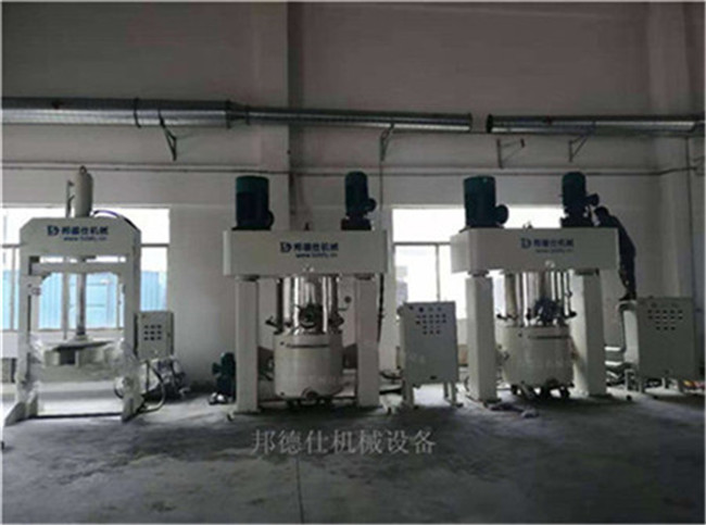 通过变频器启动行星架低速浆轴及高速分散轴,从低速调到高速进行搅拌,根据生产工艺,可从各管口加入各种材料,适时启动真空泵进行真空下工作,停止工作时应从高速调到低速,最后停止转动,打开真空阀放空才能升降横梁,拉出料缸才能进行下一轮工作。