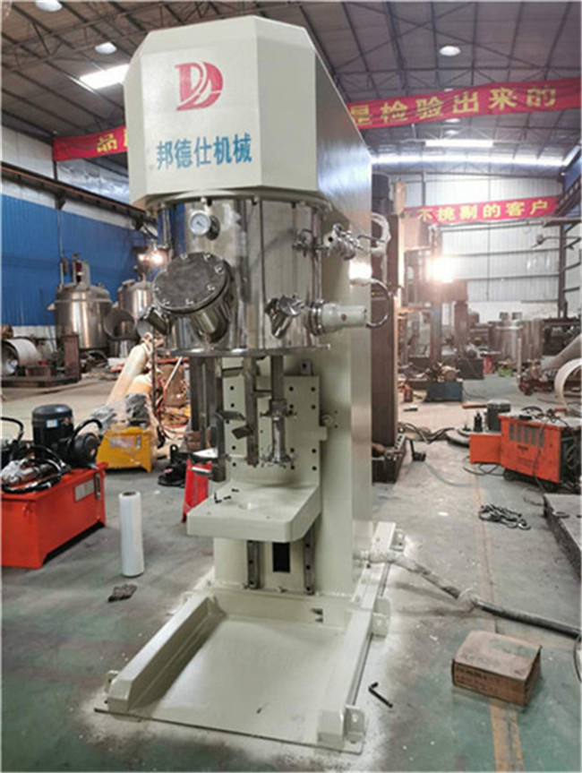 双行星真空搅拌机工作过程中,两支平行的搅拌桨按设定的固定旋转比例运转,沿搅拌桶公转的同时亦快速自转,同时搅拌桶内有随公转同步运转的回旋刮板不停旋转,使物料由搅拌桶内壁移动到搅拌桨附近,搅拌器的运转方向与公转可同向亦可逆向,达到不同剪切目的。
